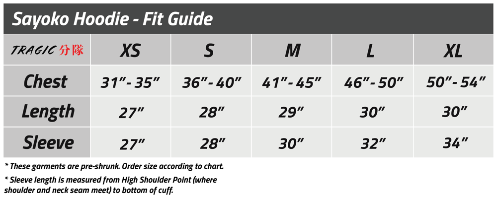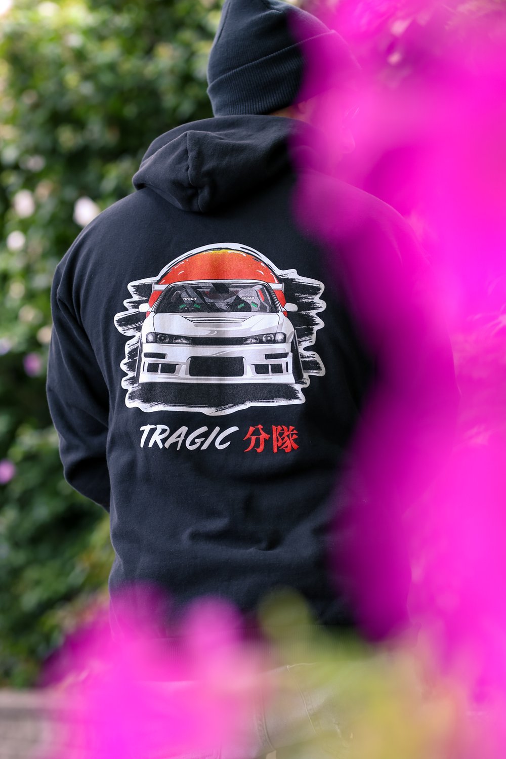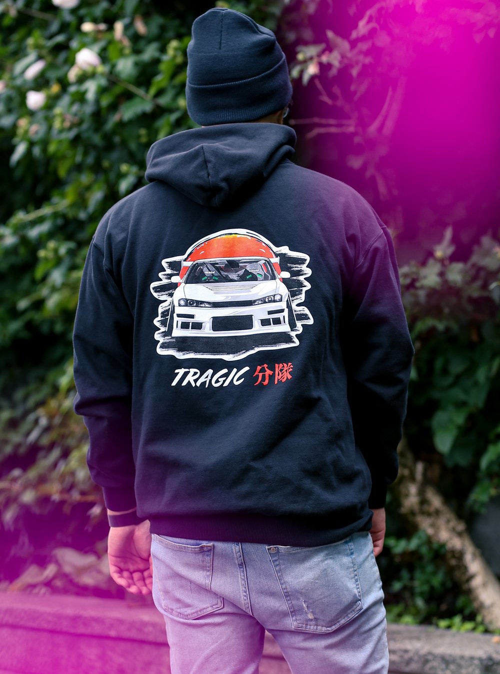 A soft, warm hoodie for the fall and winter months. On the front, it has the updated 'Tragic Squad' text logo. The back of the hoodie features a front end depiction of the TRAGIC S14, named 'Sayoko' followed by our classic logo under it.